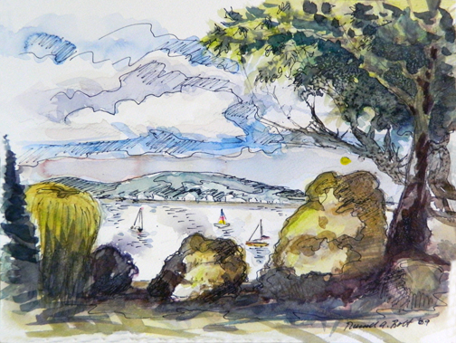 Original, one of a kind, watercolor on paper painting. Unframed. Image measures approximately 11 inches high x 14 inches wide.