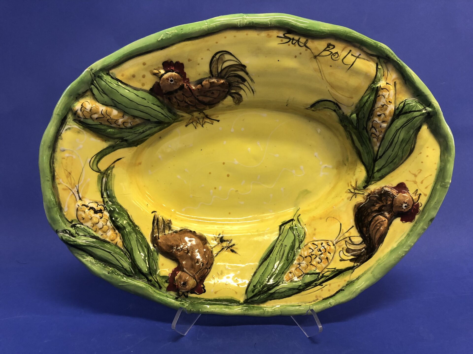 Rooster Platter is one of a kind original design created by Sue Bolt. Platter is a hand constructed, hand painted low fire ceramic. Platter is 17 inches long by 12 inches wide and is 2 1/2 inches deep it is dishwasher safe