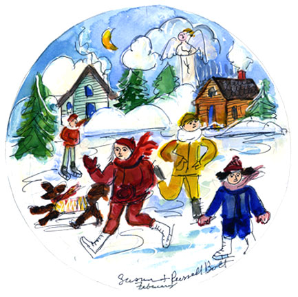 February-The kids are on a snow day. They are enjoying the day at the ice skating pond.