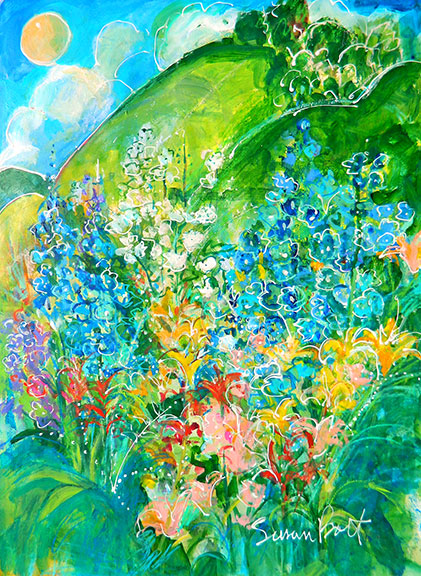 Field of Dreams – Print by Sue Bolt. Print image plus signature measures 11 inches by 14 inches and may be cropped slightly from the original painting to fit standardized framing requirements. All prints are sold unframed and are not matted.