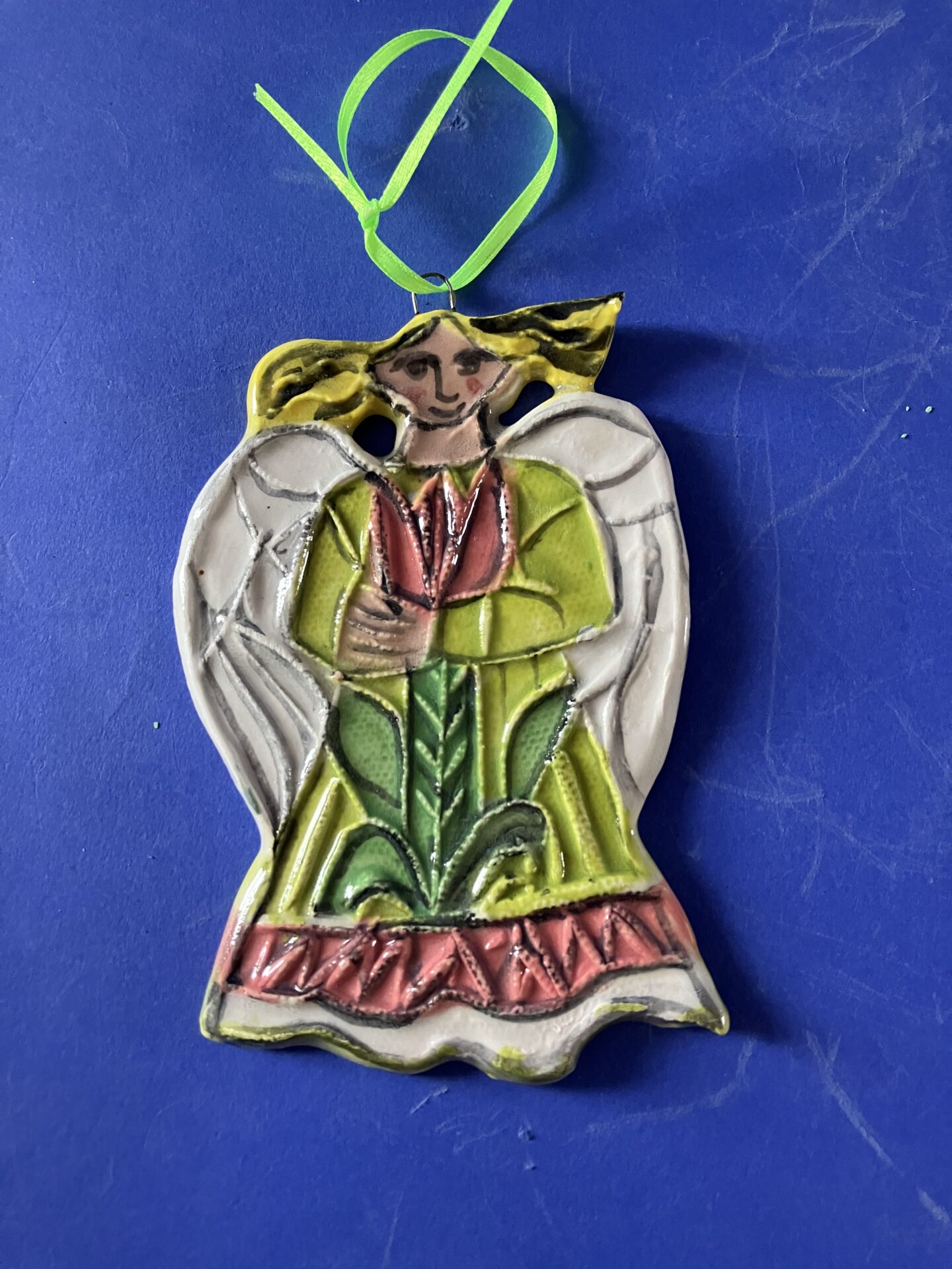 Angel With Tulip is a hand pugged, hand painted low fired ceramic. Angel is 4 1/2 inches tall by 3 inches wide.