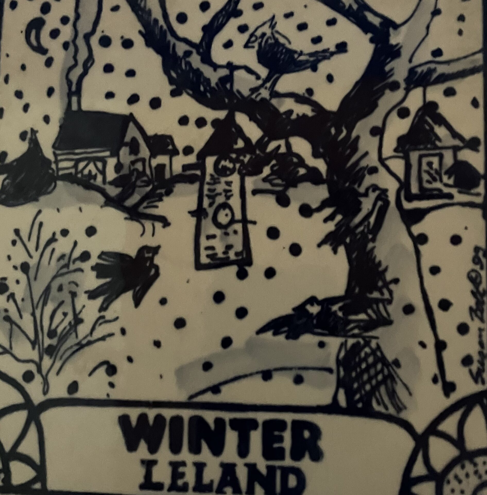 6×6 Limited Edition Blue and White tile picturing Leland in the winter .Low Fire ceramic tile original design created by Bolt Studio. The tile is a limited edition with only 2 in stock